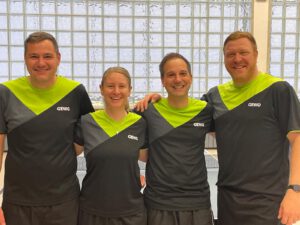 Im folgenden Auswärtsspiel bei der bisher noch nicht aktiv im Saisonbetrieb gewordenen SG ESV/PSV hieß das von Jörg ausgerufenen Motto: „Klein gegen Groß“. Zunächst ersetzte Kapitän Jens die „Kleinen“ Lehmänner, Cara und Remo durch die „Großen“ Fiona und Stephan. Dann stellte er noch die Doppel komplett um, so dass der „kleine“ Aufsteiger aus Pforzheim etwas überrascht gegen den „großen“ Titelaspiranten in die Doppel startete. Kalle mit Jörg und Jens mit Pierci ließen nix